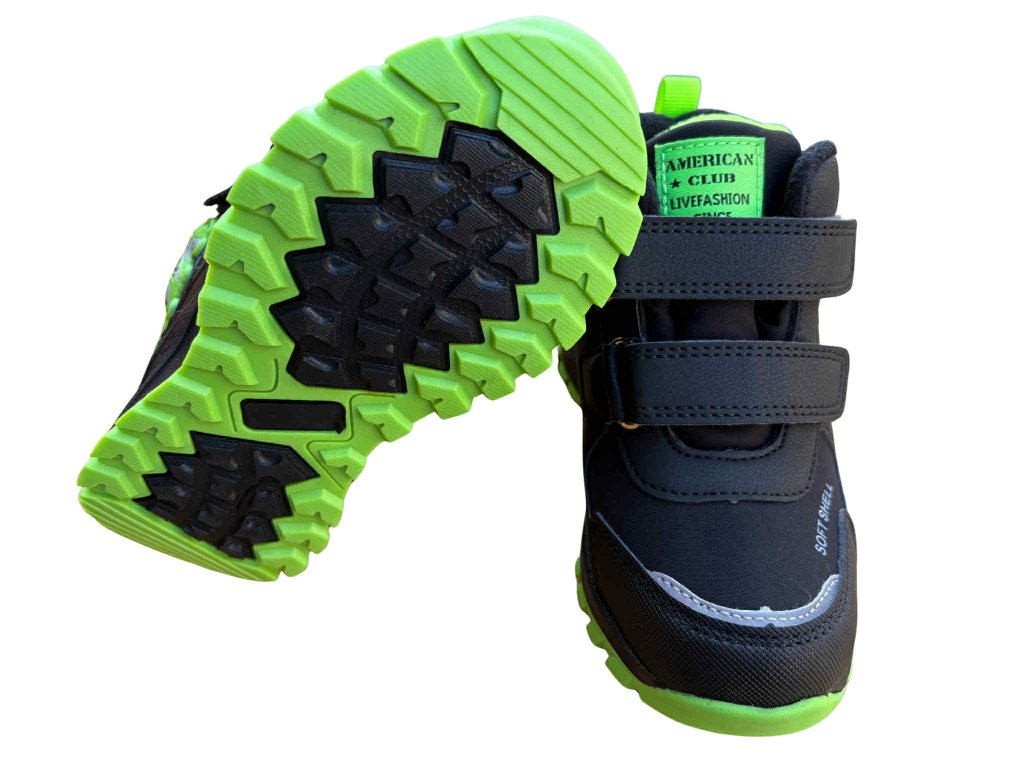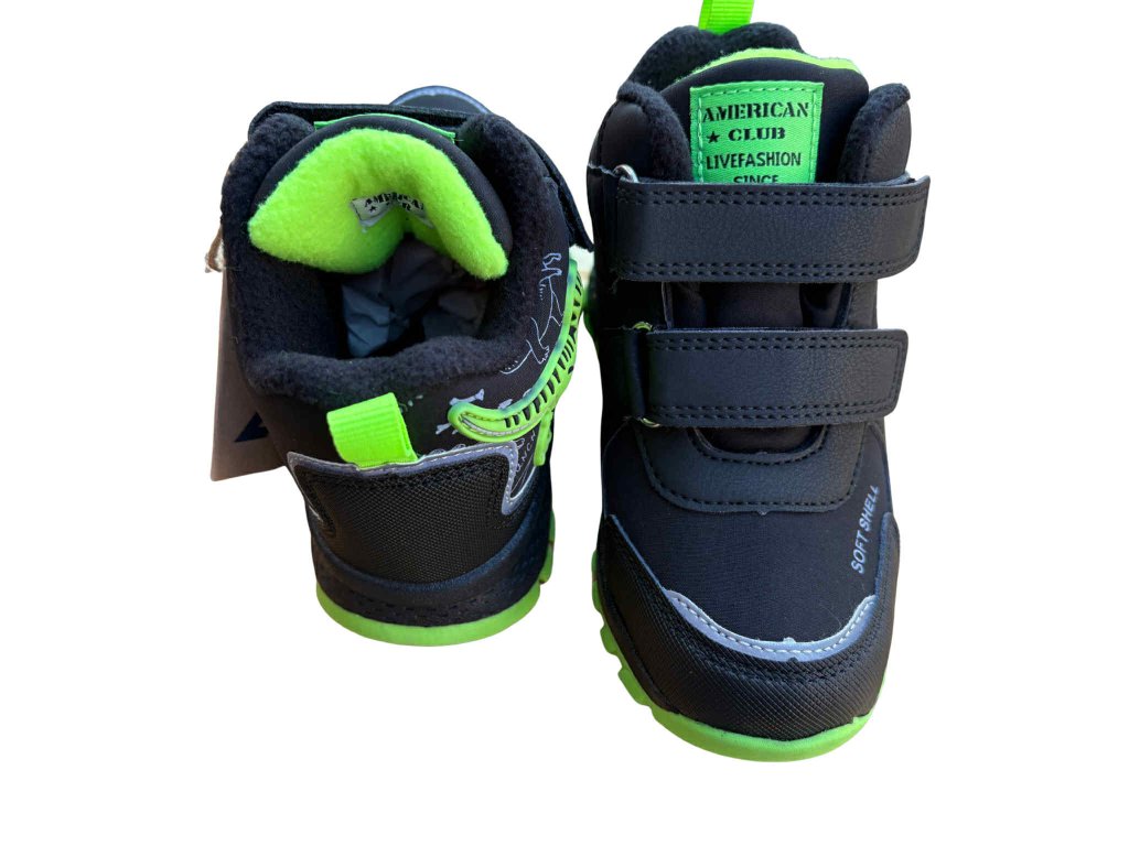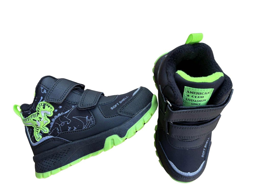 Dětské zimní softshellové boty American Club – zelené s dinosaurem.