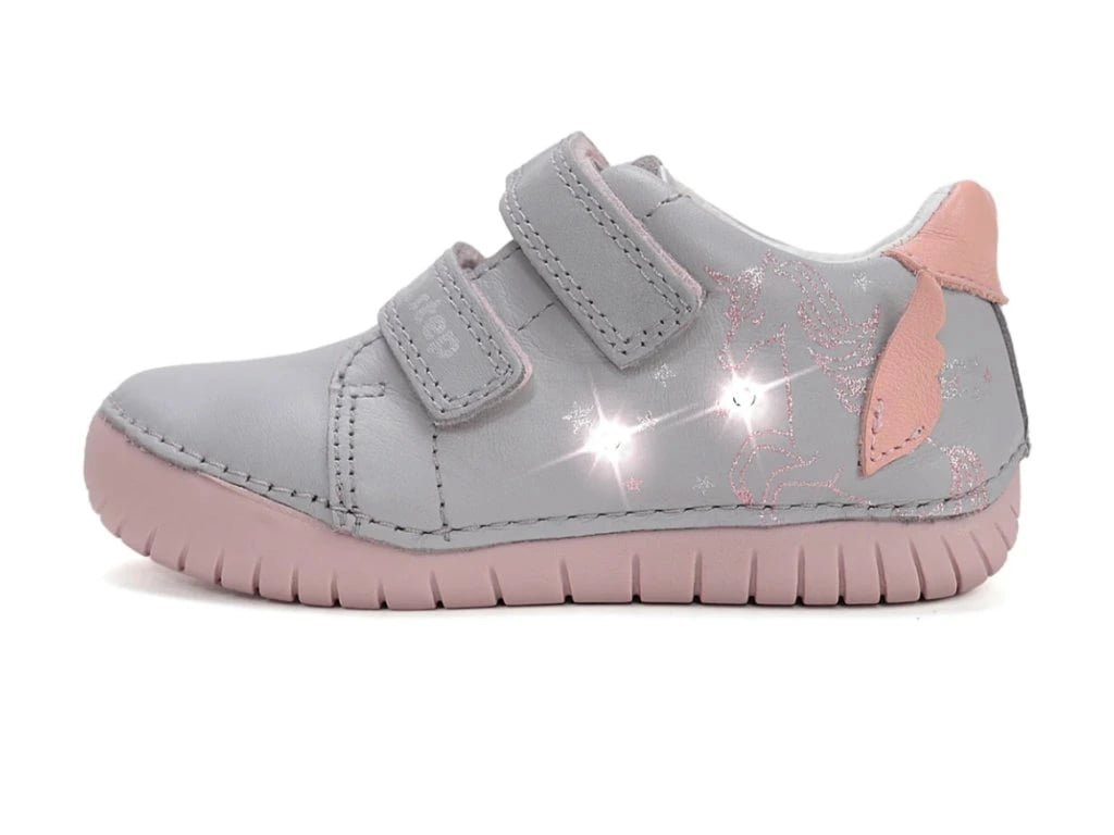 Model DD Step S050-61970A ve světle růžové barvě je navržený jako celoroční vycházková obuv, která respektuje přirozený vývoj dětské nohy a zároveň nabídne něco navíc – svítící LED diody na svršku, které se aktivují při došlapu. A co je nejlepší? Na patě je praktické tlačítko, díky kterému lze světýlka jednoduše vypnout a znovu zapnout. Když chce malá slečna zářit, boty svítí při každém kroku. Když už světýlek bylo dost, stačí jedno zmáčknutí a je klid.