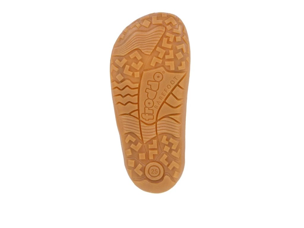 Barefoot konstrukce s nulovým dropem, flexibilní podrážkou a prostornou špičkou podporuje přirozený vývoj dětské nohy.