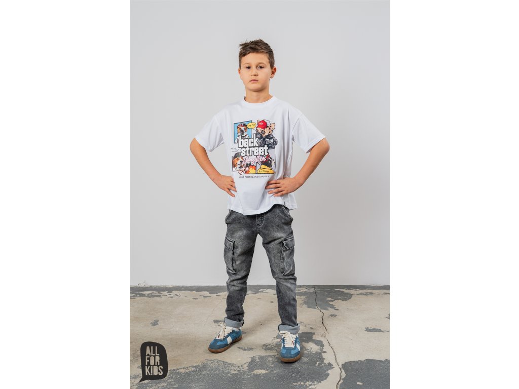 Stylové chlapecké kalhoty All for kids v šedé barvě s klasickými i postranními kapsami.