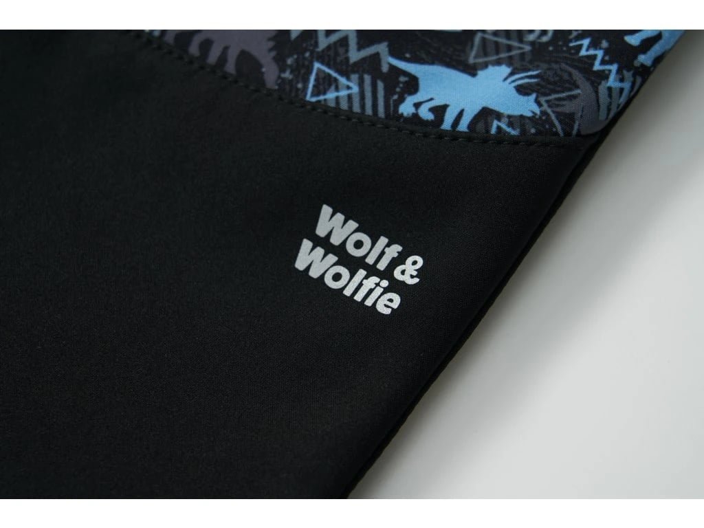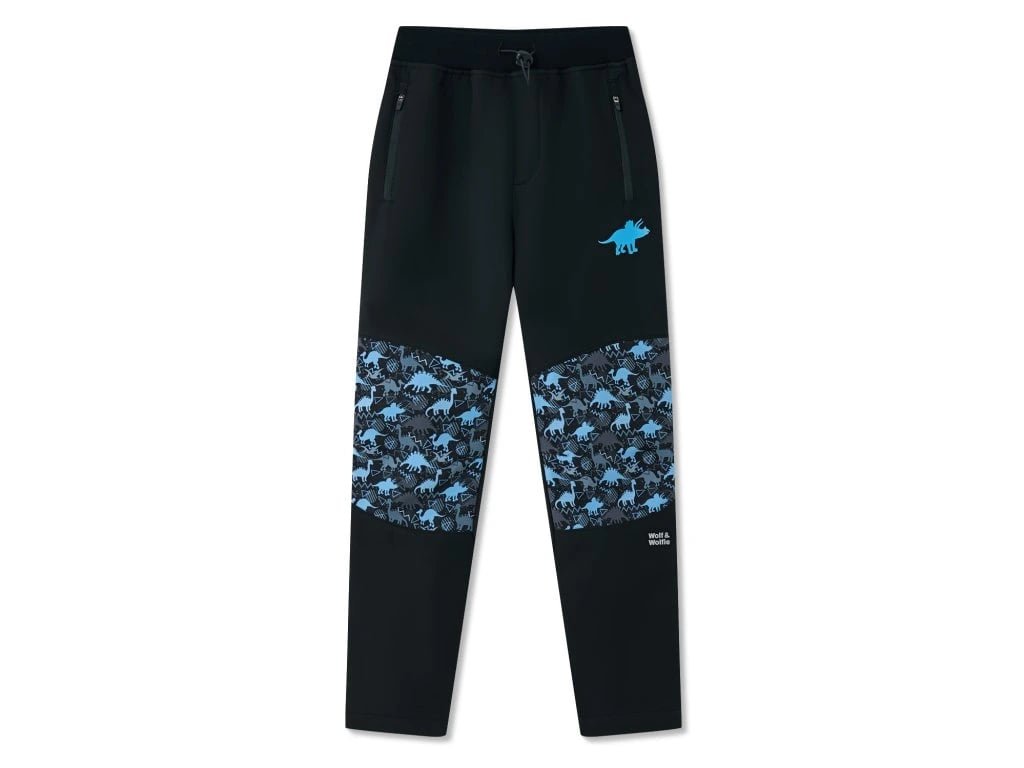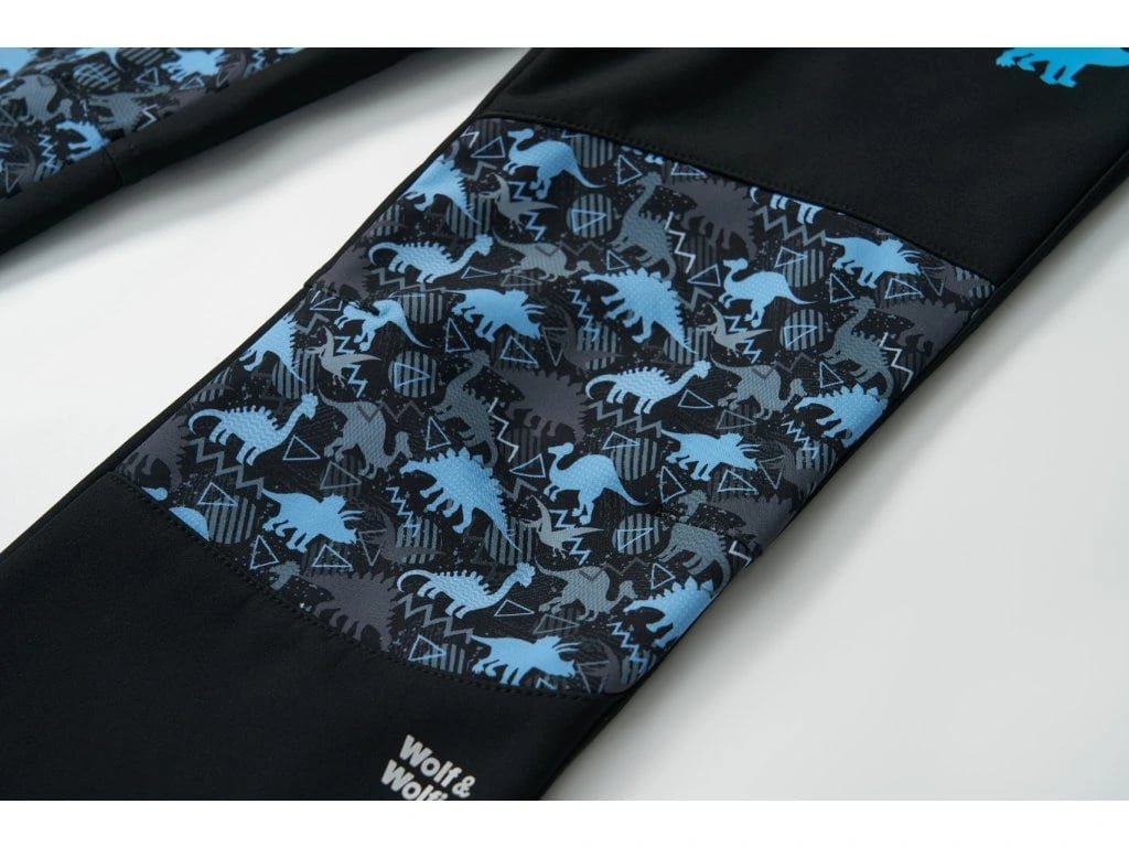 Dětské softshellové kalhoty v černé barvě s modrými kolenními panely s dinosaury. Zateplené, odolné, ideální na podzim a zimu.