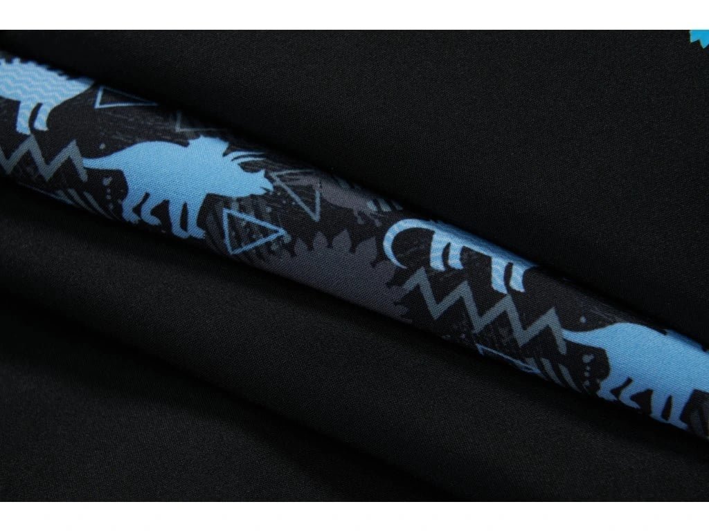 • černá barva s modrými kolenními panely s motivem dinosaurů