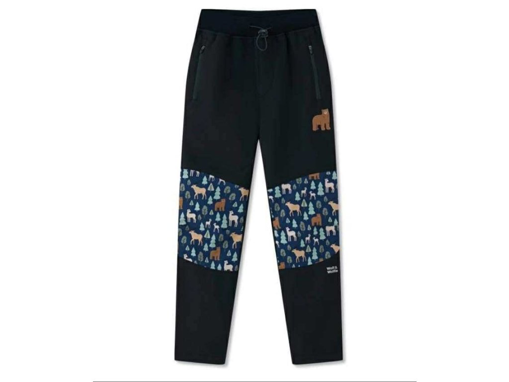 Stylové a praktické! Tyto dětské softshellové kalhoty v černém provedení jsou oživené tmavě modrými kolenními panely s veselým motivem lesních zvířátek.