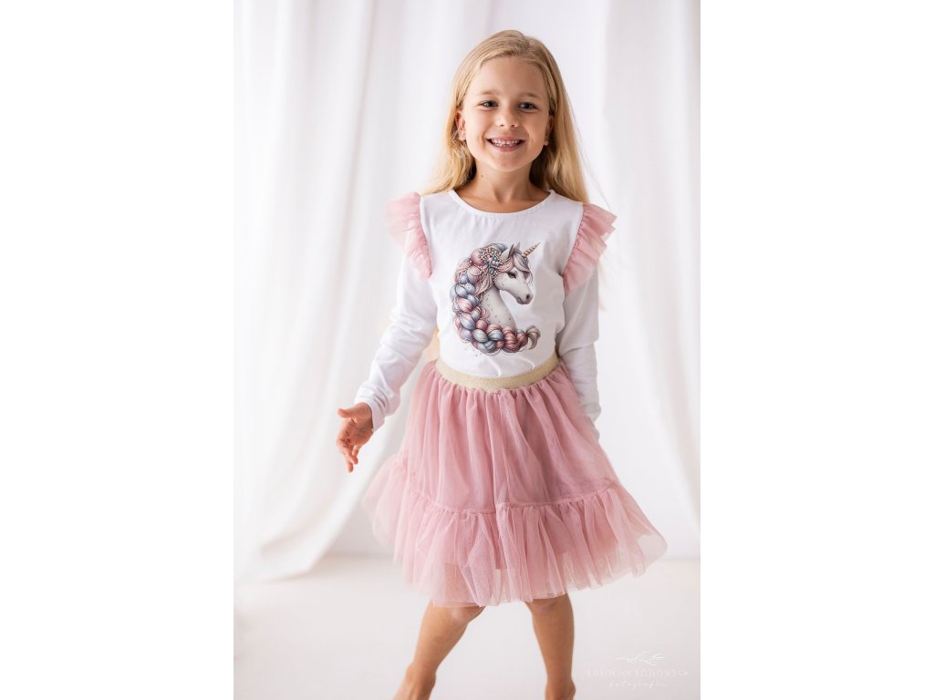 Bílá dívčí blůzka s dlouhým rukávem a jemnými volánky na ramenou je ozdobena nádherným potiskem jednorožce s pastelově růžovou a světle modrou hřívou. Díky kvalitnímu bavlněnému materiálu je příjemná na nošení a perfektně se hodí jak k sukni, tak ke kalhotám.