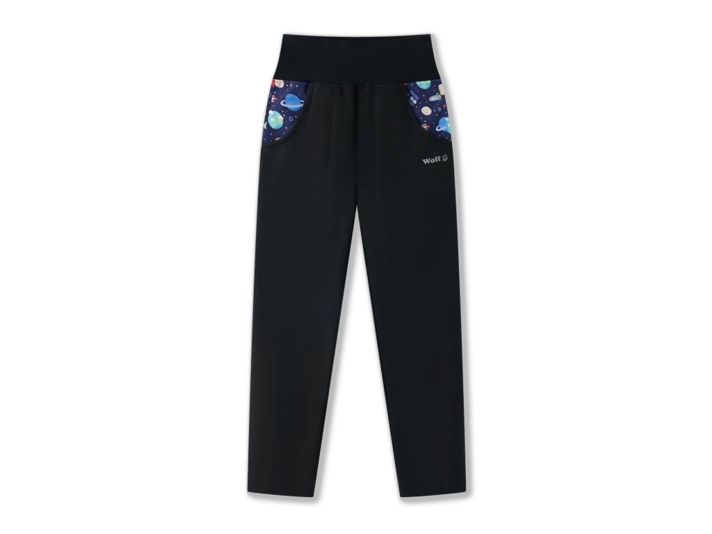 Na zadní straně najdete drobný vesmírný motiv – planety a raketu, které dodávají kalhotám hravý klučičí styl.