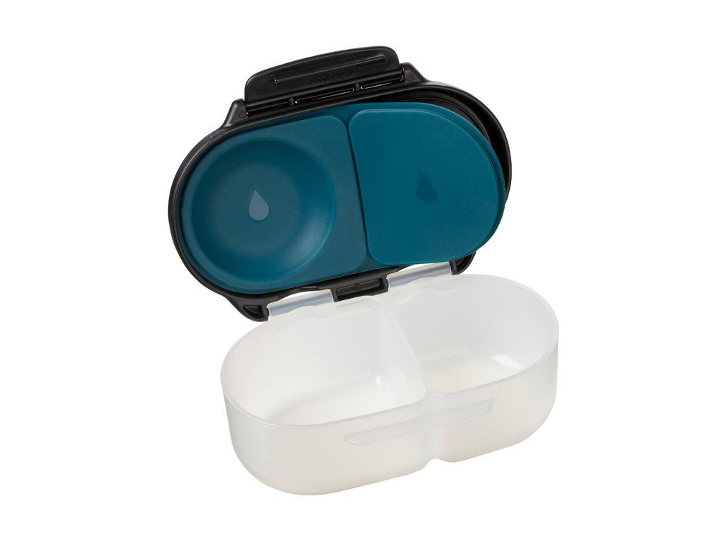 Box nabízí dvě oddělené přihrádky, které umožní přehledně oddělit různé druhy svačin – například ovoce, zeleninu, pečivo, jogurt nebo ovocné pyré. Není vhodný na tekutiny.