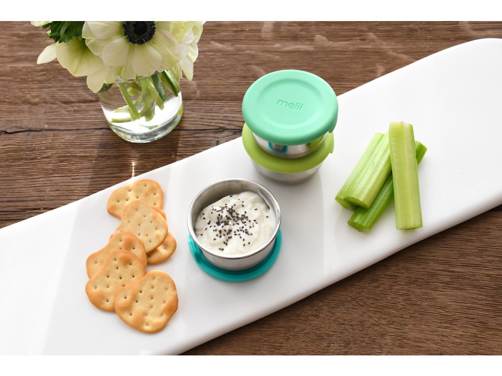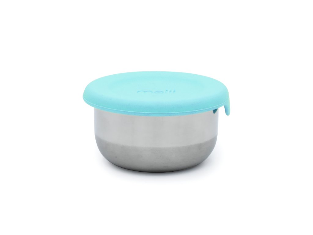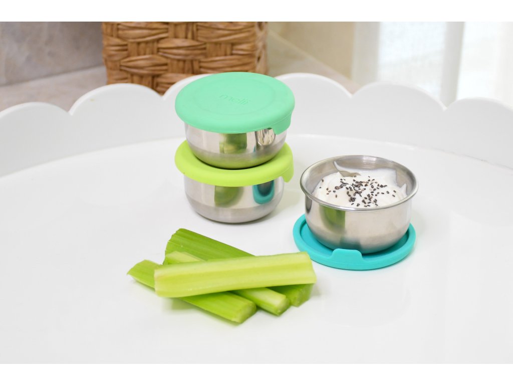 Sada tří nerezových dóziček Melii s barevnými silikonovými víčky je ideální na malé porce jídla – omáčky, oříšky, ovocné kousky nebo dipy.