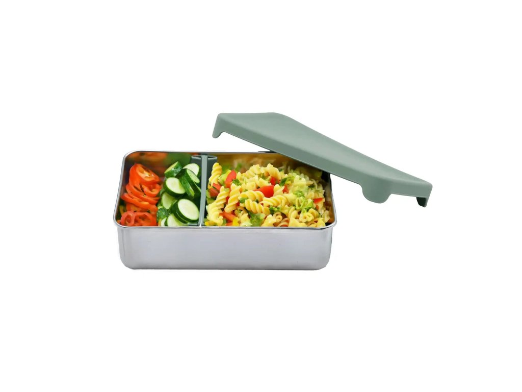 Odolný nerezový bentobox 740 ml se silikonovým víkem. Bez pachů, hygienický, s posuvnou přepážkou. Ideální krabička na obědy a svačiny s sebou.